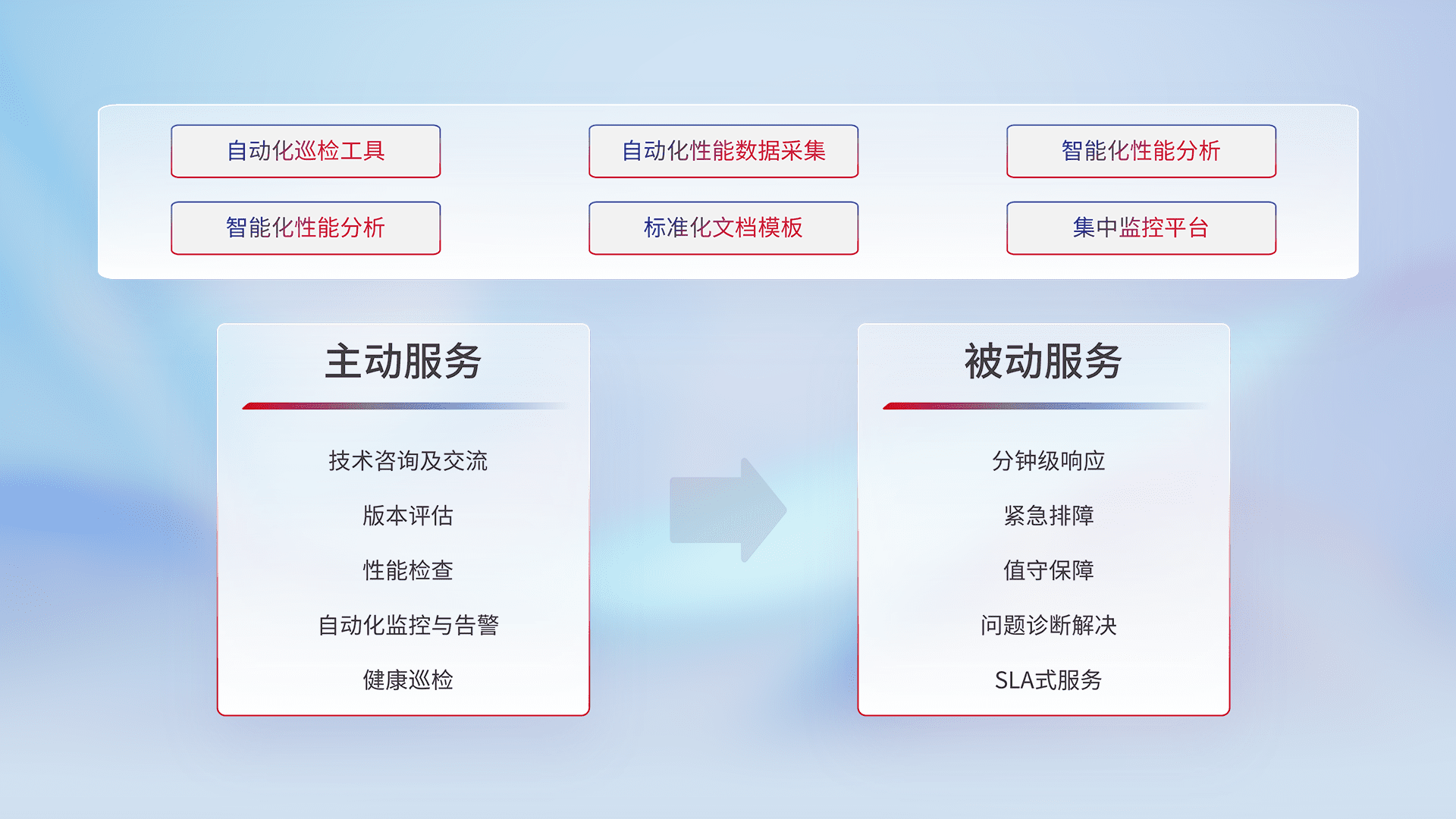 智能化工具和标准化文档,,,,保障服务质量,,,提供主动服务(包含技术咨询、、版本评估、、、、性能检查、、、自动化监控与告警、、健康巡检)和被动服务包含(分钟级响应、、、紧急排障、、值守保障、、问题诊断解决、、SLA服务)。。