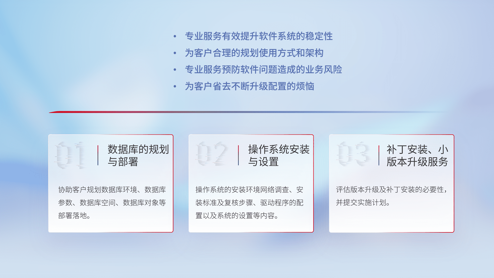 为客户提供软件规模升级、、、、快速部署、、、按需配置的专业服务,,从数据库的规划与部署到操作系统的安装与设置,,,,再到补丁安装和小版本升级提供支持。。。。